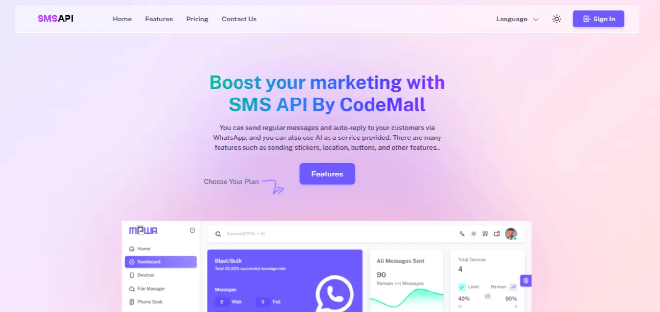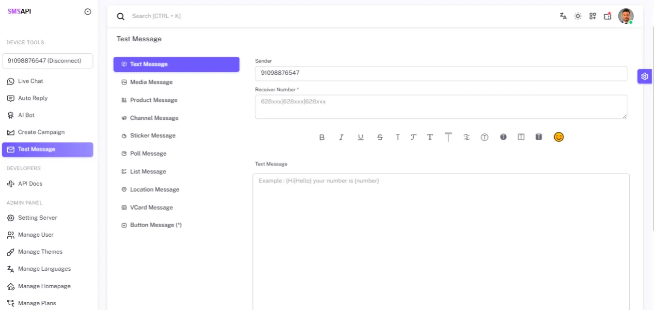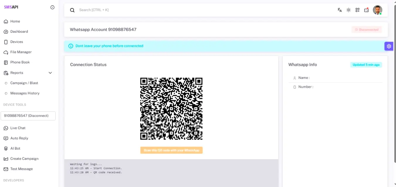 This system allows you to connect multiple WhatsApp numbers and devices, send bulk messages, build AI-powered chatbots, manage subscriptions, and offer WhatsApp APIs to your customers — all from a modern, clean, and fully responsive dashboard.